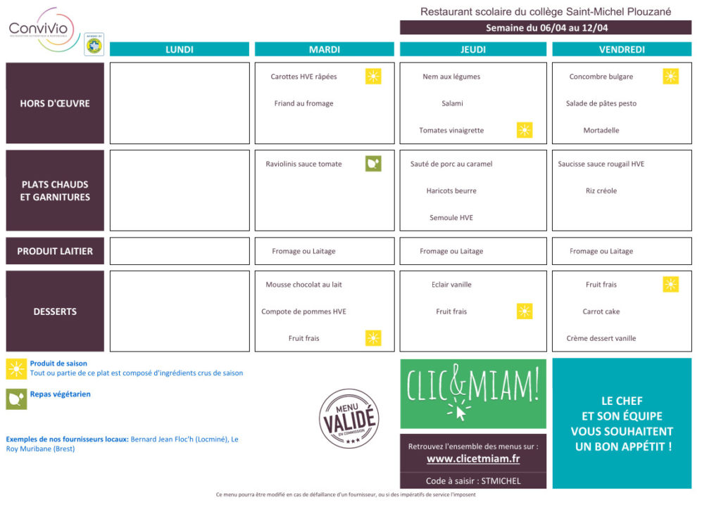 Menus du 7 au 10 avril